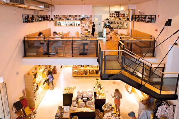 Foram precisos três anos de obras para recuperar o edifício. À medida que a reconstrução ia decorrendo, os dois fundadores iam amadurecendo ideias, descobrindo que o pé alto da ala principal e a arquitectura labiríntica das restantes salas e nichos permitiam desmultiplicar o conceito e “integrar outras áreas que espelham a nossa cultura”. O que “começou pela loja”, que ocupa todo o rés-do-chão, expandiu-se a dois mezaninos — de um lado, livros, álbuns de música e um novo nicho infantil; do outro o café-bistrô com uma carta sazonal inspirada na gastronomia algarvia. Cresceu para salas interiores, com duas alas dedicadas a objectos de decoração e utensílios para casa e cozinha, e uma galeria, que funciona como sala de exposições e eventos, incluindo experiências gastronómicas (já lá vamos). E subiu ainda ao terraço, onde funciona o bar com esplanada e vista para a praia e para as torres sineiras da antiga igreja de Santo António (integrada no museu local).