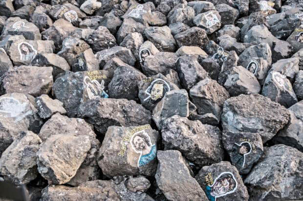 É que dão música, as rochas deste pedaço de costa em Santa Cruz de Tenerife.  A história de uma arte canta de seixo em seixo, embalada no ritmo do suave marulhar. Jimi Hendrix, Elvis Presley, Madonna, Janis Joplin, Brahms. Cem rostos icónicos do mundo da música sobressaem nos rochedos. Uma exposição de “retratos para melómanos”, lê-se numa das rochas, obra de Stoyko Gagamov. Foi em 2011 que a música deu à costa em Santa Cruz de Tenerife, quando o artista búlgaro, radicado na ilha espanhola desde 2008, começou ali a deixar, quase todas as manhãs, mais uma figura da ecléctica coletânea, ficaremos mais tarde a saber. Elton John,  Miles Davis, David Bowie, Chopin. Corremos a costa como quem colecciona cromos, à procura dos artistas preferidos. Entre os desenhos, um pescador lança a cana ao pôr do sol de Tenerife, alheio à sinfonia que entoam as rochas. O rádio portátil sintoniza um jogo de futebol.