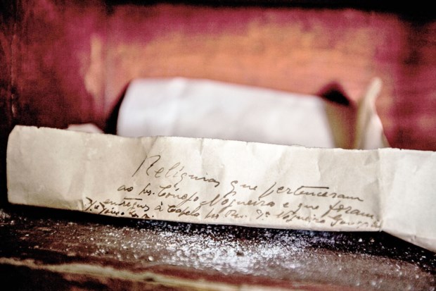 O portão de entrada aparece ainda antes do início da explicação dos guias, mas é a primeira peça a chamar a atenção. Foi construído em Bolonha em ferro forjado e detalhes em bronze reluzente, com as iniciais de Jesus, Maria e José — a Sagrada Família — no topo. Mantendo a coerência, de Itália veio também a porta que se encontra imediatamente a seguir, fabricada em madeira preciosa e com incrustações em marfim e madrepérola.