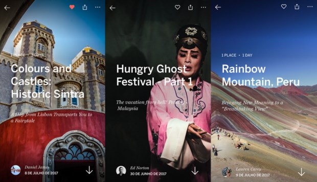 Além do feed inicial, que apresenta todos os conteúdos partilhados pelos utilizadores seguidos na aplicação, é possível encontrar outras histórias por categorias no separador “discover” (aventura, cidades, ruínas, costas e ilhas, road trips, entre outras). No entanto, como a plataforma não tem caixa de pesquisa, não é possível procurar temas ou destinos específicos. E não permite editar fotos, comentar posts ou enviar mensagens a outros utilizadores.