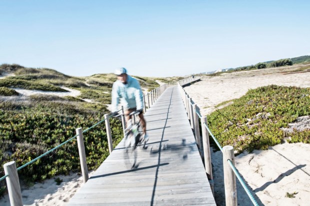 É como no poema de Robert Frost: chegados a Árvore, depois da ponte que atravessa a ribeira de Silvares, a estrada bifurcou-se num bosque amarelo (e azul e verde) e sendo nós um só viajante, tivemos de fazer uma escolha. Tomamos, pois, a estrada menos viajada, perpendicular ao trânsito domingueiro do passadiço — e isso fez toda a diferença. É que as cordas que limitam o caminho acabam por desaparecer, deixando-nos abandonados entre as dunas, que deixamos sem remorsos para trás, e o “mosaico de habitats” da reserva natural que se desdobra à nossa frente em três camadas.