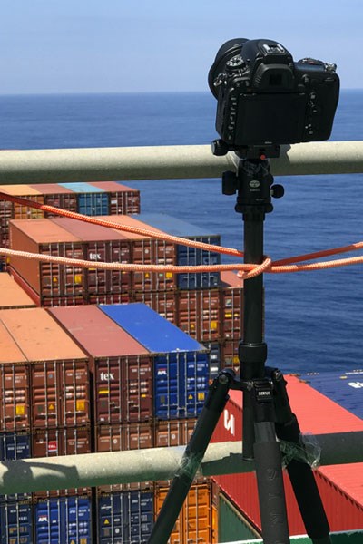 Jeff prendeu cabos à volta das pernas do tripé e reforçou tudo com fita adesiva. Desta forma, o fotógrafo conseguiu estabilizar a sua máquina fotográfica, que durante 30 dias viajou à boleia de um cargueiro — disparou 80 mil fotografias, condensadas num timelapse de 10 minutos.