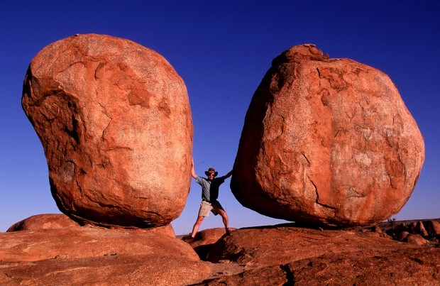 Entre os "Berlindes do Diabo", para a fotografia. A curiosa dupla rochosa tem por nome oficial Devil's Marbles e em aborígene Karlu Karlu. David Gray/Reuters