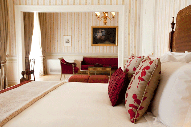 Abrimos a porta e, como a Alice no País das Maravilhas, passamos para o outro lado - uma sala à nossa direita, o quarto à esquerda. E a cama, alta (ou somos nós que, como Alice, nos sentimos pequenos?), coberta com um fofo edredão branco e quatro grandes almofadas. O mobiliário é antigo - todo impecavelmente restaurado pela Fundação Ricardo Espírito Santo numa profunda obra de remodelação que levou o palácio a fechar durante um ano, reabrindo em Março de 2009 - mas há duas ou três cedências ao conforto moderno: um ecrã plasma, uma máquina de café Nespresso, um telefone móvel. Só depois descobrimos os tais pormenores.