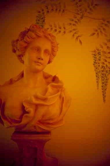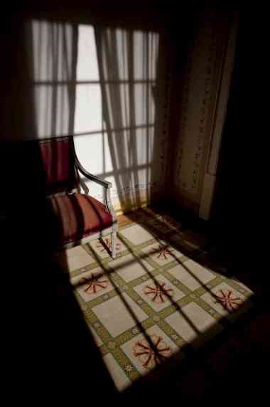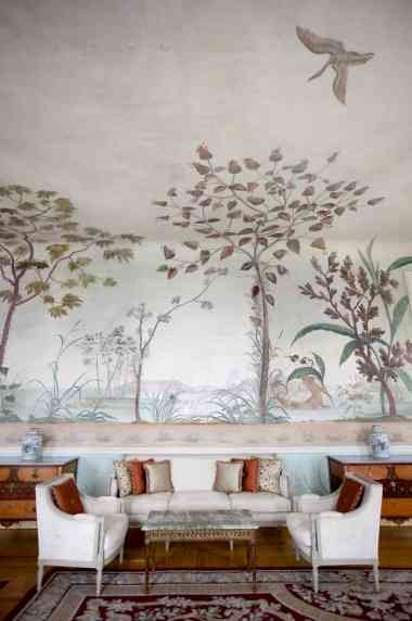 Passamos por uma sala com as cenas ingénuas dos frescos que o francês Jean-Baptiste Pillement ali pintou no século XVIII, por outra com as paredes forradas a seda pintada à mão, pelo piano antigo, por bustos, quadros, mesas de mármore, móveis requintados, recantos discretos. O som da harpa está mais distante e parece-nos agora ouvir o restolhar de saias de anquinhas como se alguma donzela tivesse subitamente dobrado uma esquina para não a apanharmos em ligações perigosas com o irresistível Visconde de Valmont (e havemos de descobrir que John Malkovich, o Valmont das verdadeiras Ligações Perigosas, filmadas por Stephen Frears, esteve instalado em Seteais).