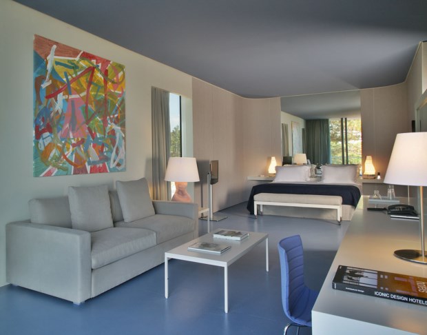 As cores escolhidas também não foram por acaso e reflectem a natureza do local. O azul do Atlântico nas paredes, tectos e chão do quarto contrasta com o branco do mobiliário, da enorme cama cheia de grandes almofadas. O quarto tem uma dimensão fora do normal, 64 metros quadrados em open space, onde tudo cabe, da casa-de-banho integrada, com a base do duche, mais recolhida, à banheira estreita e rectangular exposta junto à janela. Pelo meio, ficam os dois lavatórios e um toucador. Este é um móvel que serve para tudo — de um lado, o toucador e o espaço para as toalhas e roupões; do outro a secretária, a televisão e a mesa de apoio onde a fruta, uns bolos e algumas bebidas dão as boas-vindas. Dadas as dimensões, este é um quarto para o qual pode, por exemplo, convidar os amigos para tomar uma refeição ou simplesmente para conversar, sentados no confortável sofá branco ou nas espreguiçadeiras dispostas na espaçosa varanda.