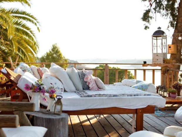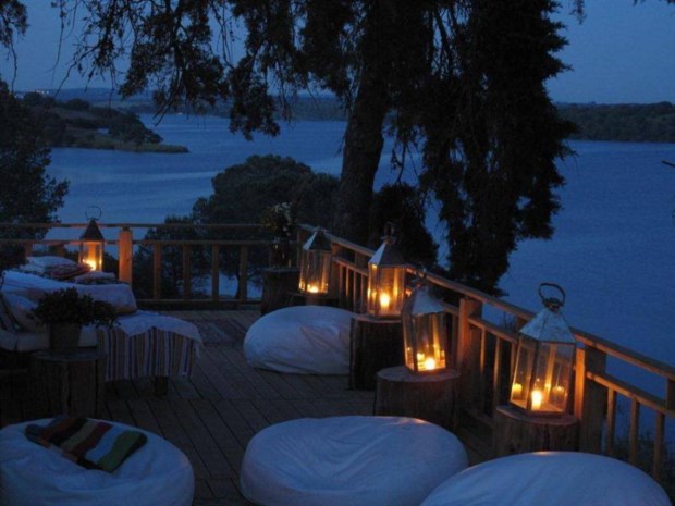 Uma esplanada coberta que se estende para um deck com vistas panorâmicas funciona como um íman. Tudo parece ter sido posto ao acaso: as velinhas, os bules, os jarrinhos com flores do campo, as pedrinhas. Até mesmo a disposição dos distintos e cómodos sofás ou das cadeirinhas, com almofadas floridas e mantas em patchwork. Mas, ao mesmo tempo, compreende-se o empenho para que toda a decoração tenha esse efeito: romântico e nostálgico, mas ao mesmo tempo descontraído.