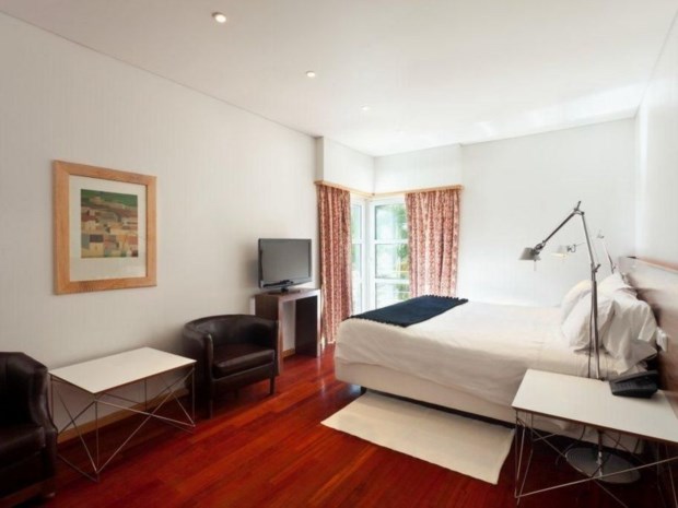 Mas, se por um lado se estranha a diferença, esta acaba por se tornar prazenteira — afinal, o que mais se quer para uma noite repousada é mesmo uma envolvência tranquila. Assim, à excepção do televisor, tudo remete para o silêncio. O soalho é em madeira flutuante. Ao centro, uma cama espaçosa e macia, feita de roupas alvíssimas, cuja cabeceira, em madeira, se estende por toda a parede. À frente desta, um aparador, também em madeira, onde a televisão foi estrategicamente colocada, e uma pequena mesa apoiada por dois maples. Numa das paredes, o roupeiro em madeira escura. Apenas três apontamentos parecem querer romper com o básico: uma cadeira e mesinhas de cabeceira brancas design e uma mantinha colorida a rasgar o branco da cama.