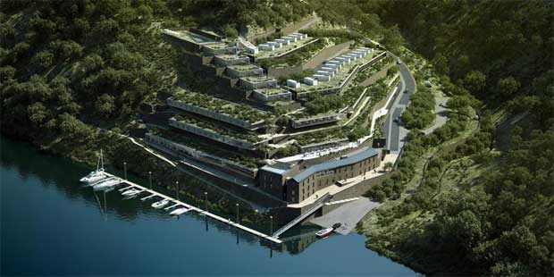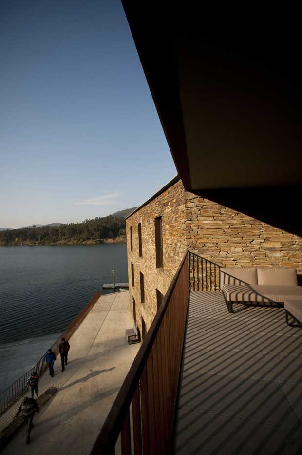 Um projecto construído degrau a degrau - literal e figurativamente. O edifício, da autoria do arquitecto João Pedro Serôdio (vencedor do prémio Villégiature 2011 para o melhor projecto de arquitectura no sector hoteleiro europeu), presta tributo aos socalcos que são a imagem de marca da paisagem duriense e, por isso, evolui em escada, sendo que aqui os vinhedos são substituídos por jardins, ainda incipientes, de aromáticas e plantas autóctones. E não só presta tributo como se integra organicamente na paisagem, quase como que camuflado, embora o seu perfil seja irredutivelmente contemporâneo, misturando xisto e vidro em formas geométricas e, a momentos, com um piscar de olho óbvio à arquitectura típica destas paragens.