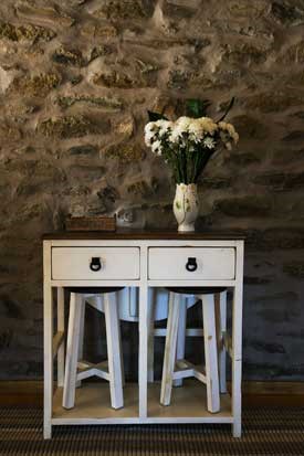 No quarto com cama de casal, a parede da cabeceira é a original da casa, pedra sobre pedra. Há um banco a um canto e mais um móvel que Anabela adaptou e hoje serve para pendurar roupa. Não há armário nem cómoda e, confessamos, sentimos alguma falta, embora consigamos perceber o argumento. "Estas casas eram, na generalidade, de gente pobre. E eram pequenas. Como nós quisemos respeitar ao máximo a traça original, algumas mantiveram-se pequenas como elas", explica Anabela. Na Formosinda, onde mais se nota é na casa de banho, que é pequena, de facto.