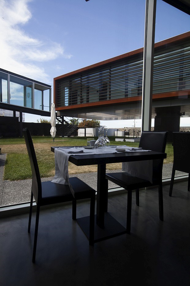 A enoteca dispõe de um acesso próprio, pelo lado da marginal de Caminha, dignificada pela fachada em tons de cobre que o arquitecto Pedro Guimarães concebeu para esta frente, cuja requalificação está há muito prometida mas tarda a chegar. A indefinição quanto ao futuro do Polis Litoral Norte continua, desgraçadamente, a impedir Caminha de apresentar uma marginal que não destoe da beleza da foz do Minho. Será preciso começar por algum lado. O hotel, pelo menos, já se move.