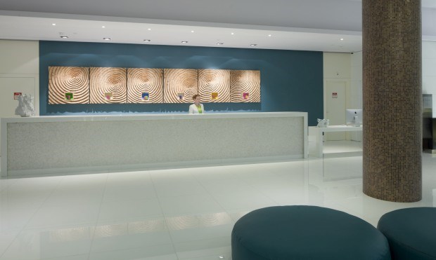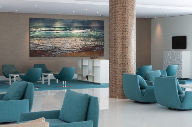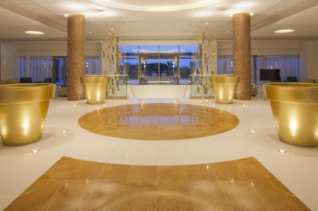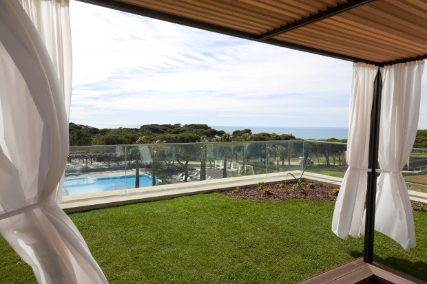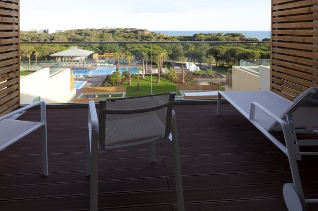 Assim que se põe um pé neste hotel, junto à Praia da Falésia, Albufeira, no Barlavento algarvio, os olhos ficam postos no mar que, ao longe, desenha o horizonte. O vidro, a forrar toda a lateral Sul, do chão ao tecto, forma uma espécie de tela na qual o verde das copas das árvores, o avermelhado da falésia e o azul do mar se misturam numa imagem que se repete por quase todas as áreas da unidade.