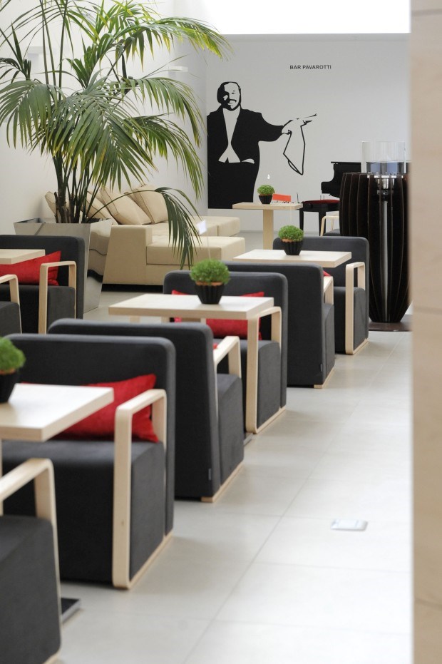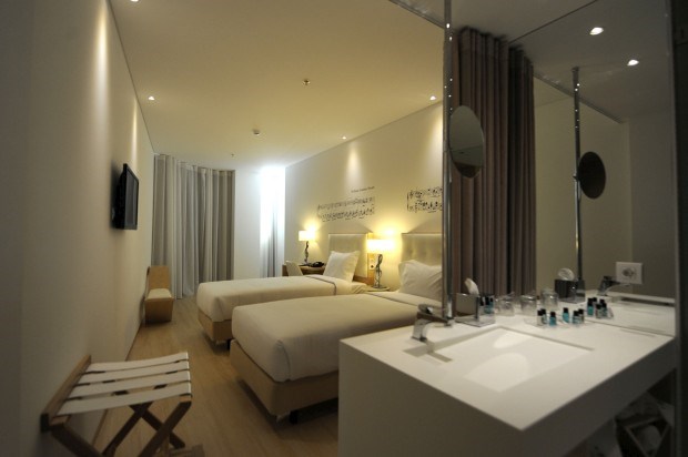 As cores predominantes são o branco e a madeira clara que também integra a estrutura do próprio hotel. Não há quadros nas paredes, apenas o tal trecho musical pintado a negro. E os suportes dos candeeiros de mesa são claves de sol prateadas. Houvesse uma palavra em português para descrever este ambiente melhor do que a inglesa clean e usá-la-íamos. Assim, ficamo-nos mesmo por essa.