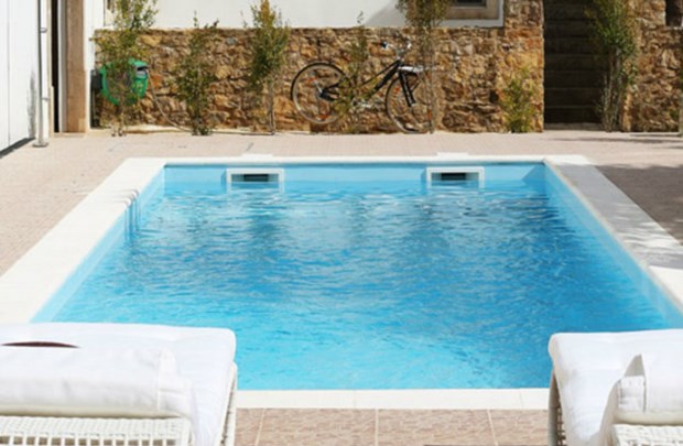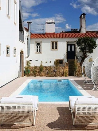 Descendo as escadas exteriores, partilham o andar duas casas independentes, a Branca de Neve e a Casa Azul. À primeira, com janelas voltadas para o centro da vila, Sofia deu uma decoração mais urbana, onde optou por colocar na parede um poema de Pessoa (Põe-me as mãos nos ombros...). Na casa ao lado, é Florbela Espanca quem guia o espaço, com vista para a serra e para o jardim da casa, onde o azul da piscina combina com a decoração interior.
