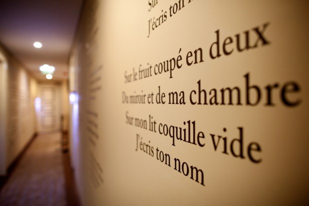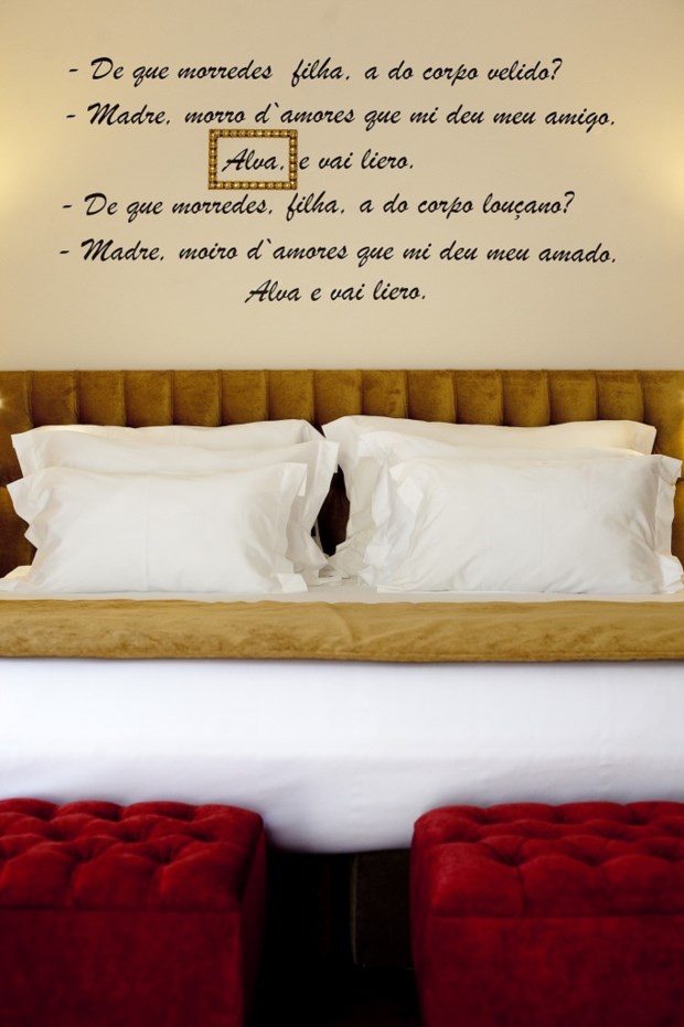 "A poesia faz falta", justifica Rebelo de Almeida. E por todo o hotel a poesia atravessa fronteiras. Brindamos o nascer do Sol com o alfacinha Filinto Elísio, com a sua Saudade Extrema que Tem a Virtude o Prémio por companhia, para descobrirmos num breve passeio as palavras do chileno Pablo Neruda, os pensamentos do alemão Wolfgang von Goethe, ou os desassossegos de Fernando Pessoa: "Vivo sempre no presente. O futuro, não o conheço. O passado, já o não tenho".