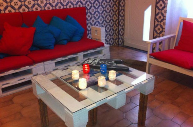 A decoração foi baseada no conceito “upcycling”, que consiste na valorização de resíduos ou objectos sem utilidade. “Por exemplo, as paletes servem de sofás e de mesa na sala, as caixas de fruta serviram para revestir os móveis da cozinha e as rolhas de cortiça para tabuleiros”, afirma Emanuel.