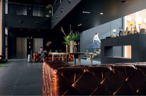 Entramos no hall da recepção e somos invadidos por um mar de negro. O chão é preto, as paredes também, assim como o tecto e grande parte do mobiliário. Tudo traçado a linhas rectas e modernas, as fachadas envidraçadas a devolver a luz necessária. Inesperada, uma grande nuvem branca levita a poucos metros do chão, sobre os dois compridos sofás de cobre brilhante, que partilham o tom quente dos poucos elementos decorativos. Sentado no braço de um sofá, mais um elemento inusitado: um manequim preto com asas de penas negras e colar dourado remata o cenário de boas-vindas.