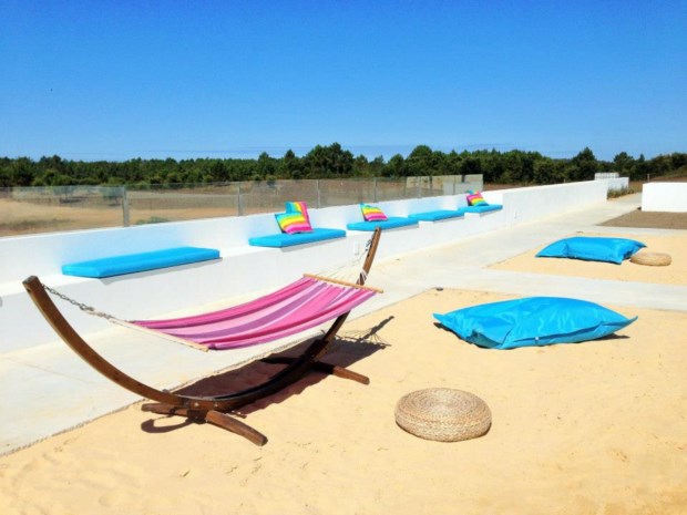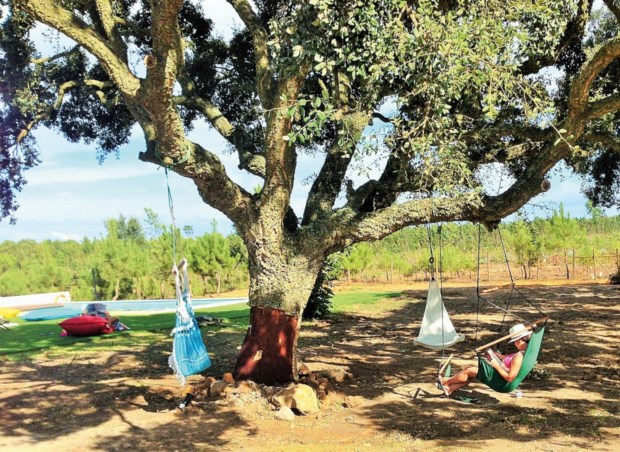 Gonçalo Marques cedeu apenas à tentação de trazer uma mala de viagem e umas botas antigas da Feira da Ladra, em Lisboa, e o forno a lenha da sogra, da Covilhã. O resto é um relvado de 1200 metros a clamar preguiça, com redes penduradas aqui e acolá nas sombras das árvores. Podíamos jurar que cheira a eucaliptos, mas não confirmámos. Há um trampolim perdido a reclamar pulos dos miúdos, uma casa pequenina de madeira para brincar e uma improvisada piscina só de areia para fazer castelos e puxar pela imaginação.