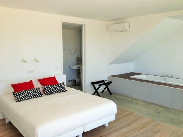 A casa alentejana, caiada de azul lavanda, tem janelas enormes, rasgadas para sobreiros capazes de dançar ao vento. Uma moldura de verde e amarelo. Todo o espaço é amplo. E um apontamento relevante da decoração deste turismo rural no campo, mas às portas do mar, é justamente essa ausência de excesso. Não se tem a sensação de carregar aos ombros o peso dos móveis de família restaurados... Há espaço livre, sem a obsessão de o preencher.