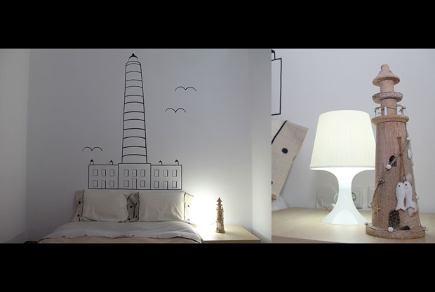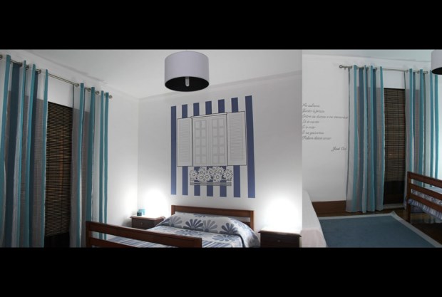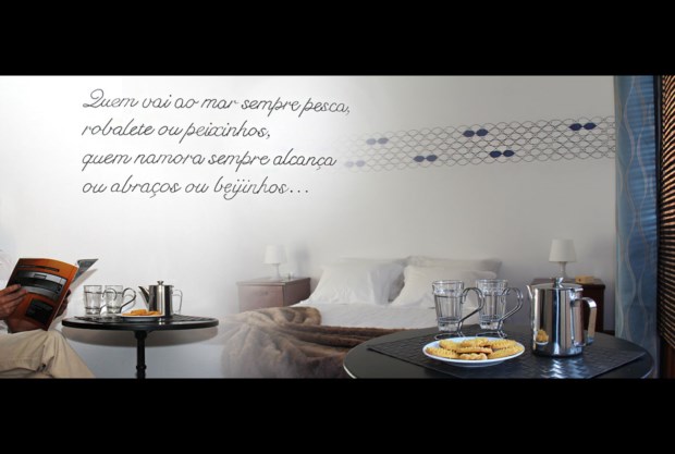 Os palheiros da Costa Nova que surgem, também, fortemente representados no quarto “Amor e uma cabana”, inspirado, como não podia deixar de ser, na imortal balada desse ilustre filho da região de Aveiro, José Cid — a letra de Na cabana junto à praia está estampada numa das paredes da suite. Aliás, importa referir que essa aposta em decorar o branco das paredes interiores com poemas e letras das canções é uma constante em praticamente toda a casa.