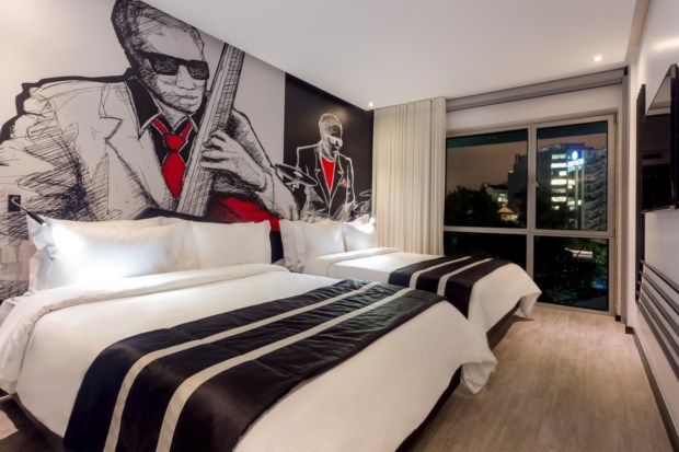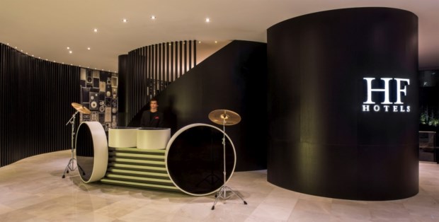 Se o nome do novo três estrelas do grupo português já não deixava margem para dúvidas, a decoração grava certezas, num ar jovial mas elegante: este hotel quer celebrar a música, e para isso não falta sequer um mini-estúdio de gravação. É o business center, com várias câmaras e ecrãs, um pequeno palco com duas guitarras, uma falsa mesa de mistura e até uma espécie de jukebox com cores eléctricas a iluminar vinis. No computador de acesso livre lê-se “No music, no life”. O som ambiente está incrivelmente alto neste recanto junto à sala do pequeno-almoço, mas na manhã seguinte havemos de descobrir que não chega às mesas de refeições.