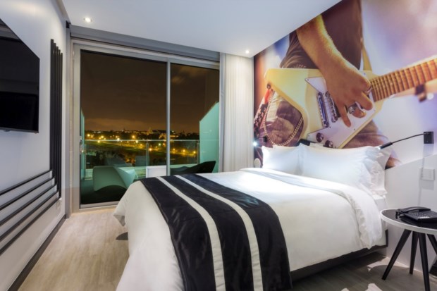 Entramos no quarto e o olhar recai imediatamente na fotografia que preenche toda a parede por detrás da cama. A guitarra eléctrica branca e amarelo-ovo é tão grande e magnética que quase lhe ouvimos os acordes rasgados. Tivéssemos vindo preparados para testar o sistema de som do quarto e não precisaríamos de muita imaginação para nos vermos (e ouvirmos) na primeira fila de um concerto. Bastava ligar o dispositivo móvel ao aparelho junto ao controlo do ar condicionado e deixar as colunas embutidas nas paredes fazerem soar as músicas preferidas. Como não é o caso, entretemo-nos a testar os painéis com touch screen que controlam os estores eléctricos e todas as luzes, incluindo iluminação ambiente amarela, azul ou de intenso vermelho (esta accionada por um sugestivo botão em forma de coração).