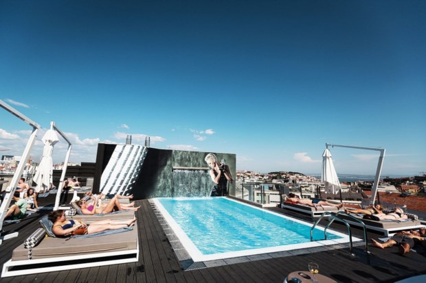 Voltamos então na manhã seguinte, que as promessas são para se cumprir. Infelizmente não podemos esperar que a piscina abra ao público e só veremos a cascata deslizar em fotografias, mas as vistas lá estão, largas e belas, envoltas numa ligeira névoa matinal. Lá em baixo, os carros já se colam no quotidiano, formando lagartas de metal que lentamente se contorcem nos caprichos da rotunda do Marquês, obedecendo ao ritmo imposto pelos semáforos. Ao contrário do que imaginámos, excepção feita a uma ou outra buzinadela impaciente, aquele ruído urbano não nos chega ensurdecedor nem incomodativo (ou será que Lisboa já fez daquela a música habitual aos nossos ouvidos?). Ainda assim, se pudéssemos era já ali que ficávamos, numa das camas espreguiçadas ao sol, entre mergulhos, bronze e, claro, muita música.
