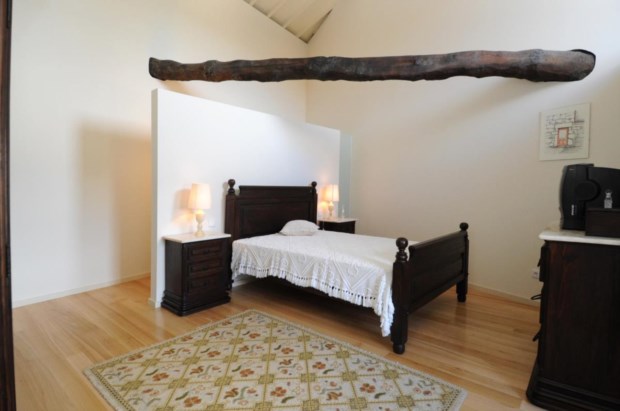 Não, não se limitou a recuperar a casa do caseiro e as cortes dos animais. Queria usar a área habitacional, o piso por cima das antigas lojas, para viver. E o resto para fazer a recepção, uma zona de refeições-jogos-biblioteca e três quartos. “Tinha de potenciar o alojamento e a única maneira era acrescentar”, diz. Construiu um edifício novo, no alinhamento do antigo, desviado apenas uns metros.