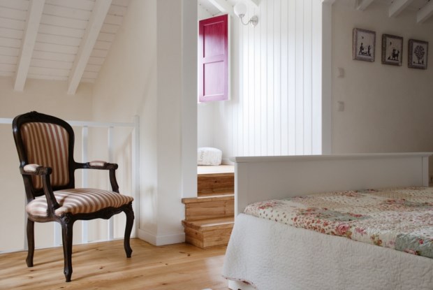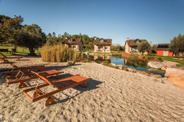 Por fora, só as cores das portadas as distinguem. Por dentro, todo o mobiliário e decoração diferem. Será difícil a um visitante não se identificar logo à partida, e na totalidade, por uma delas. São pequenas casas, de rés-do-chão e primeiro andar, ambos em open space (só a casa de banho tem portas a proteger), e sempre com um ar acolhedor. Nós ficámos na Cotovia, a casinha de janelas vermelhas, onde na decoração pontuam as flores e os pássaros, o ambiente provençal. Cheirava a Primavera, apesar de ser Verão. Mas foi do Inverno e do Outono que me lembrei, quando olhei para a poltrona defronte à lareira, e quando o sofá que se converte em cama exibia mantinhas tão fofas e acolhedoras. Lembrei-me do Outono e do Inverno, mas regozijei-me por ainda ser Verão para poder experimentar sem medo o tal espelho mágico que organiza a disposição das casas. A piscina biológica estava à nossa espera.