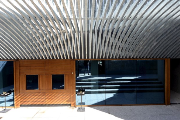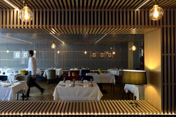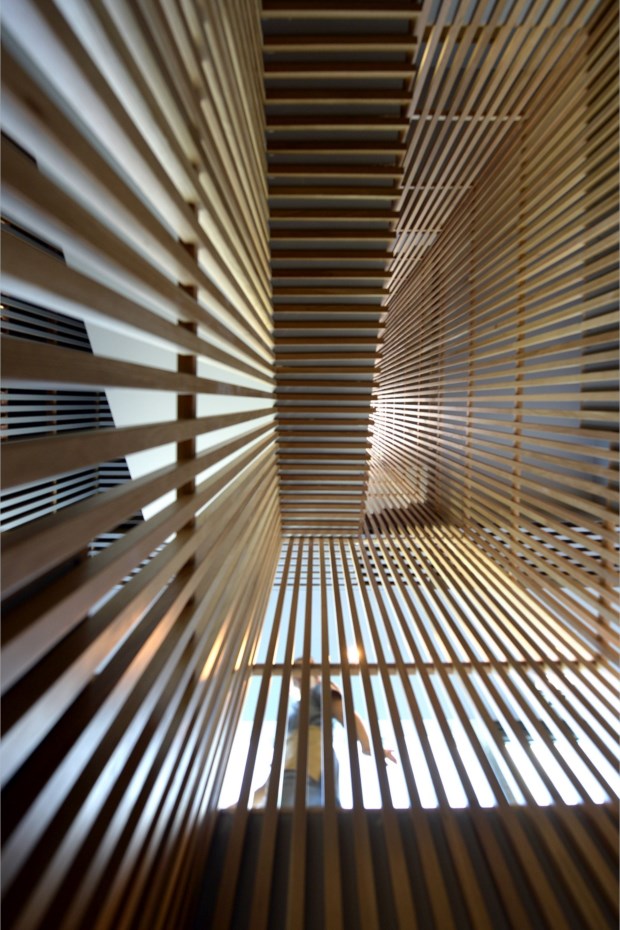 A obra foi projectada pelo gabinete de arquitectura Cerejeira Fontes, que tomou a opção de cobrir a fachada com um ripado metálico, que acentua a verticalidade da nova ala do hotel. Essa escolha repete-se no interior, onde tectos e paredes voltam a ser cobertos por ripados, desta vez em madeira. Essa solução torna-se uma verdadeira assinatura dos arquitectos bracarenses autores do projecto do Santa Luzia à medida que percorremos os vários espaços do hotel — e traz à memória que os ripados são centrais num dos projectos mais icónicos deste gabinete, a capela Árvore da Vida, no Seminário Conciliar de S. Pedro e S. Paulo, em Braga, vencedora do prémio ArchDAily de 2011 para o melhor edifício religioso.