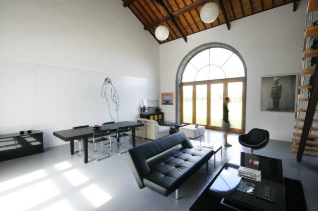 Há o enorme desenho de uma mulher nua, de costas, numa das paredes, a reproduzir uma obra da escultora Luísa Constantina. Os próprios janelões desenham a paisagem ao fundo, com o verde verdíssimo da relva, a piscina, as árvores, e uma estrada em terra batida que vai levar-nos à casa principal.