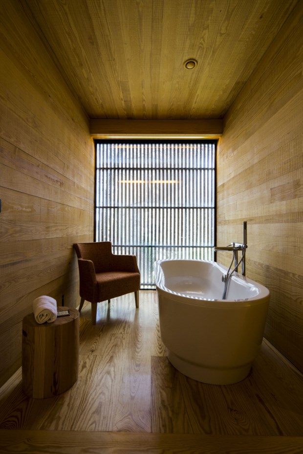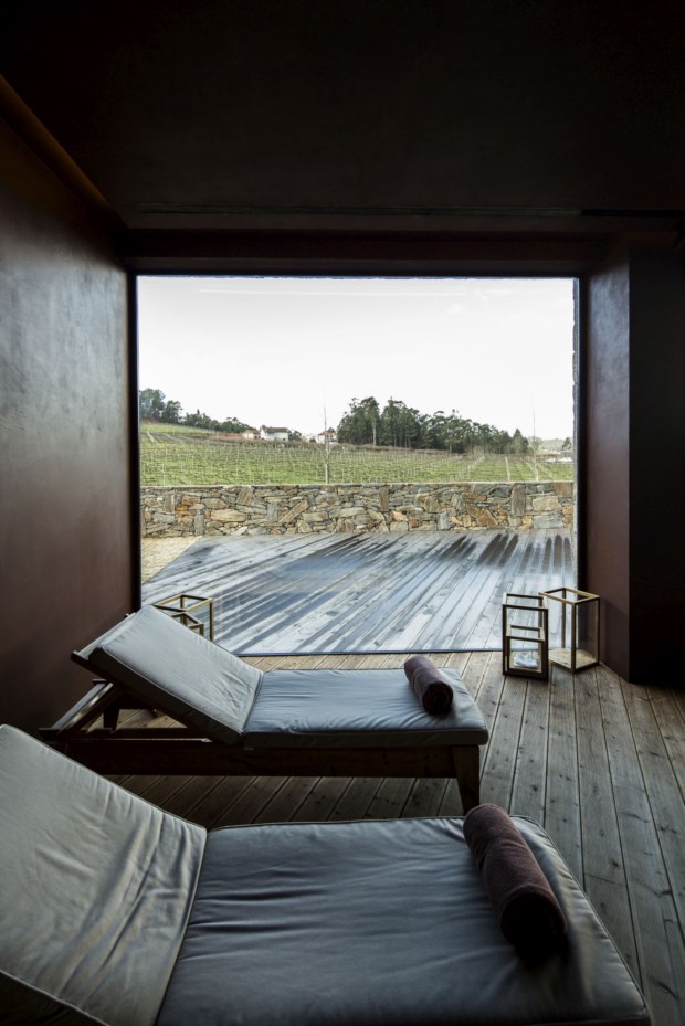 Para além deste edifício onde estão as áreas comuns, há duas casas de granito, a nascente e a poente, por onde se distribuem os 29 quartos, mais um bloco onde se encontra a piscina e o spa. Movimentarmo-nos entre cada um deles exige sempre uma passagem pelo exterior, que no Verão há-de ser agradável, mas no Inverno, mais ainda quando chove, nem por isso. Pensamos nisto alto e João Portugal explica: não foi uma opção, o gabinete de arquitectura, liderado por Fernando Coelho, foi confrontado com a possibilidade de intervir apenas nas áreas já construídas na Quinta de Sanguinhedo. Daí que o projecto tenha passado muito pela recuperação do que já existia e pela reutilização de materiais — “por exemplo, 85% da pedra usada na obra de requalificação já existia no terreno”, comenta João Portugal.
