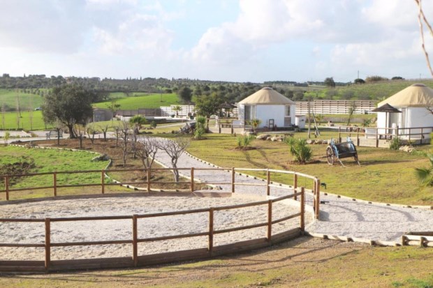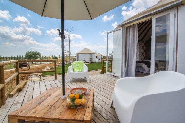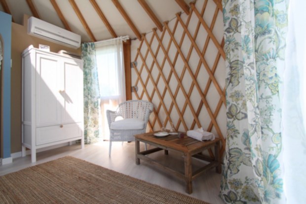 Um caminho de pedras alvas conduz-nos por entre a relva até às quatro yurts. Parecem redondos e brancos cogumelos de capuz bege, dois de cada lado, um belo terraço individual em frente. Confessamos que antes de virmos pensámos que surgiriam que nem ovnis na paisagem, mas estão agradavelmente inseridos no ambiente envolvente graças à decoração cuidada do exterior, minimalista e onde abunda o verde e o branco, muita madeira e pormenores decorativos, como antigas carroças, candeeiros em barro trabalhado e pequenas estatuetas.