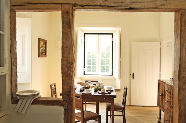 Sim, estamos no campo, mas também num pedaço com história, como a da avó Machado ter sido pedida em casamento junto à roseira Bela Portuguesa que fica por detrás da casa principal — peça rara no país, segundo os botânicos — ou a do batalhão de ingleses escondidos entre estes arcos em pedra durante a Invasão Francesa. História recente: em 2009, Miguel, gestor de empresas e com o tempo ocupado pela indústria do plástico, e Carmo, que trabalhou durante 20 anos em multinacionais, decidiram mudar de vida e adquirir a quinta. “Quando comprámos, estava tudo muito degradado”, recorda o empresário. Puseram as mãos à cabeça e depois à obra para recuperar o casario, preservando a traça e a envolvência — que começa nas tábuas corridas do chão, vai pelas molduras de granito e termina nas traves de madeira do tecto.