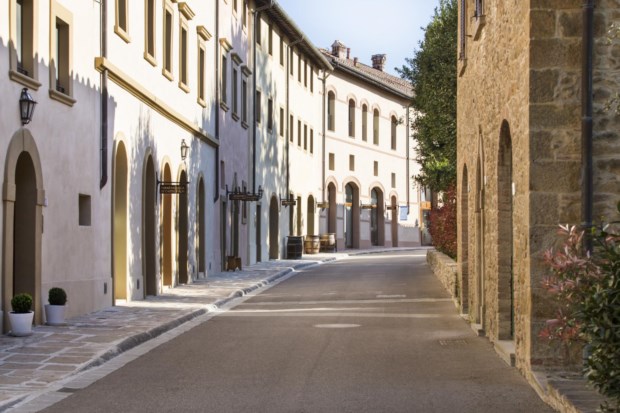 Os traços arquitectónicos são típicos da Toscana — as paredes de pedra, as portadas de madeira, as telhas de barro — mas a perfeição dos pormenores denuncia o passe de ilusionismo. Não há negrume ou tinta a descascar paredes ou madeiras, a rua está impecavelmente pavimentada, os canteiros frondosos e os letreiros das lojas ainda a cheirar a novo. É como se estivéssemos numa aldeia construída para servir de cenário a um filme. Não tem as rugas da autenticidade, mas não vale menos por isso.