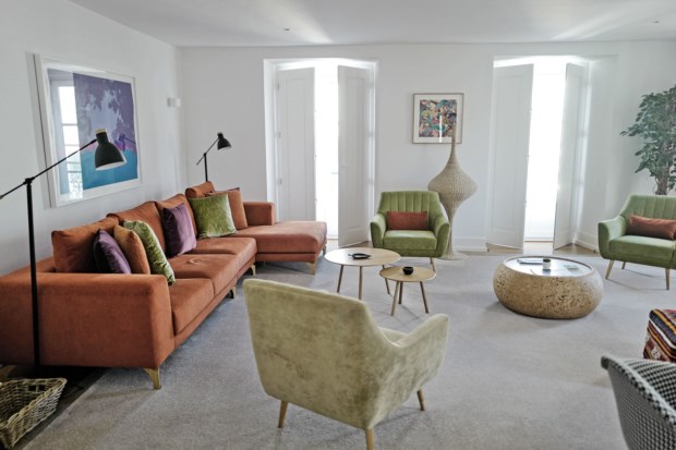 A sala é enorme, com dois grandes sofás — não há razões para implicarem porque há espaço para todos —, uma mesa com meia dúzia de cadeiras e televisão, e até um recanto com um sofá que, junto à janela e praticamente de costas para a televisão, convida à leitura. Há arte portuguesa nas paredes da sala, assim como na cozinha, com o objectivo de dar a conhecer, sobretudo aos hóspedes estrangeiros, o que se faz por cá.