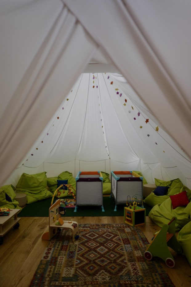 Quanto ao espaço para os mais novos, eles podem ficar aqui a partir dos seis meses de idade. Existe uma sala resguardada para os bebés dos seis meses aos dois anos; depois outra para as crianças mais velhas com mais luz, espaço e brinquedos.