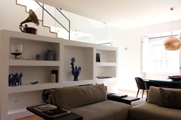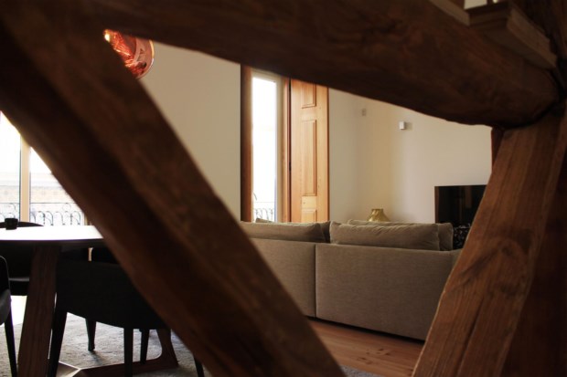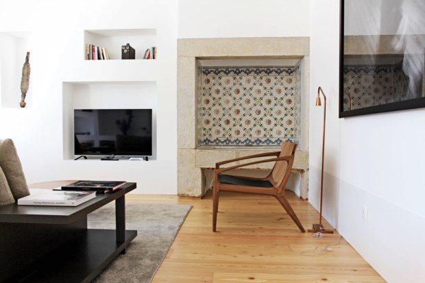 Quando as obras começaram, os azulejos pombalinos foram guardados, assim como foram protegidos determinados espaços das casas, como as chaminés dos fogões das cozinhas que agora são chaminés de lareiras, por exemplo. Ao todo são dez apartamentos e a decoração ficou a cargo de Sofia Bragança. Ali ficamos, na sala, a ler um livro sobre a vida e obra de Paula Rego, enquanto os miúdos sobem para os quartos — um abre os livros para estudar, outro aproveita para ver televisão. Não viemos fazer turismo, só passar uma noite fora, mas conseguimos imaginar os franceses, os brasileiros ou os italianos a sair porta fora e a experimentar a vida nocturna no Chiado e no Bairro Alto. Por isso, subimos escada acima, calçamo-nos, chamamos os miúdos, vestimos os casacos, sem esquecer o chapéu-de-chuva, e a saímos porta fora.