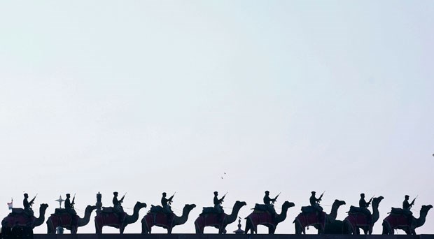 ÍNDIA. 29.01.2012. A guarda fronteiriça e os seus camelos ensaiam para uma cerimónia que põe fim às celebrações do dia da república indiana. Parivartan Sharma/Reuters