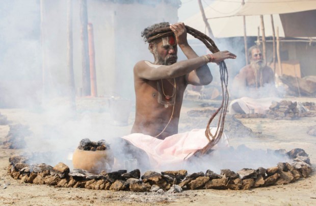 ÍNDIA, 30.01.2012. Um Sadhu ata o seu cabelo sentado num círculo de fogo durante uma cerimónia de oração pela paz no mundo. Em Sangam, Allahabad. Jitendra Prakash/Reuters