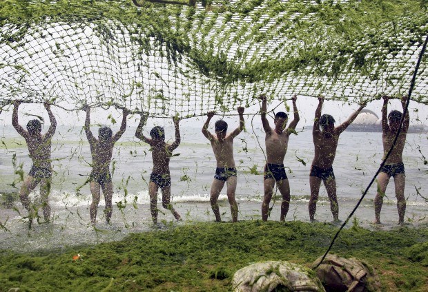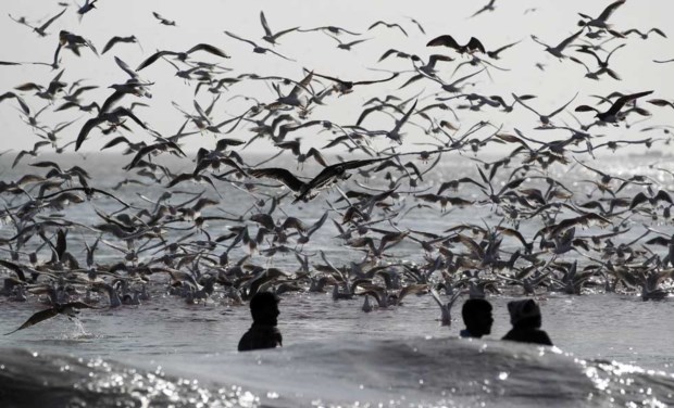 OMÃ, 04.02.2012. Eterna união entre gaivotas e pescadores, aqui a lidarem com as suas redes. Na costa de Dibba al-Fujairah. Karim Sahib/AFP