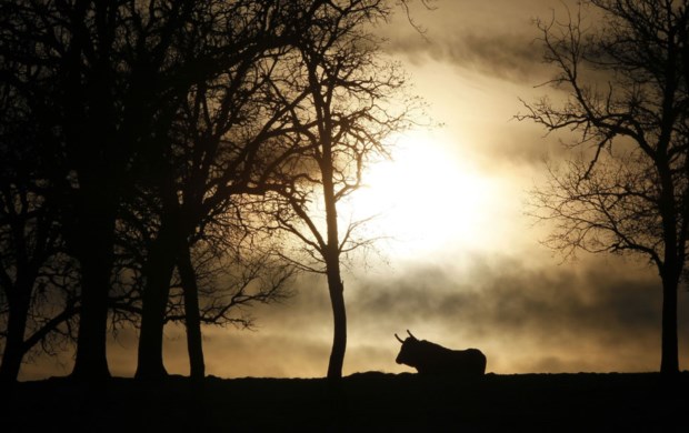 ESPANHA, 10.02.2012. Um touro de Burgos, elemento das manadas conhecidas como "toros del frío": vivem numa quinta situada a 1000m acima do nível do mar e passam metade do ano entre neve e gelo. Cesar Manso/AFP