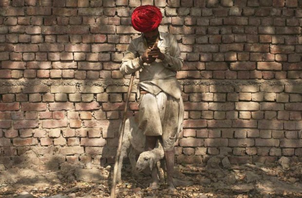 ÍNDIA, 26.02.2012. Um pastor nómada em momento de descanso moderno: estava a ouvir música no seu telemóvel. Imagem captada numa estrada de Noida, perto de Nova Deli Parivartan Sharma/Reuters