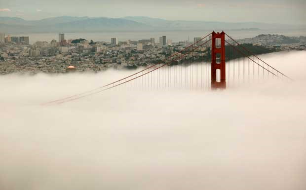 EUA, 22.02.2012. Dois AC 45, do vencedor da America's Cup, Oracle Racing, a navegar perto da Golden Gate Bridge de São Francisco. Robert Galbraith/Reuters