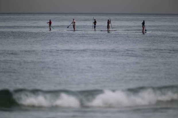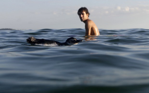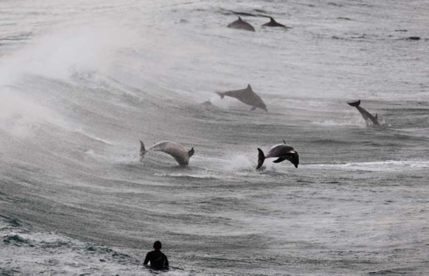 AUSTRÁLIA, 25/09/2012. Um surfista observa um grupo de golfinhos na Bondi Beach, em Sydney Daniel Munoz/Reuters