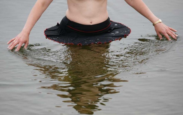 RÚSSIA. 26.01.2012. Uma participante do clube Cryophil, de nadadores de Inverno, a entrar no rio Yenisei. Estão -26ºC Ilya Naymushin/Reuters