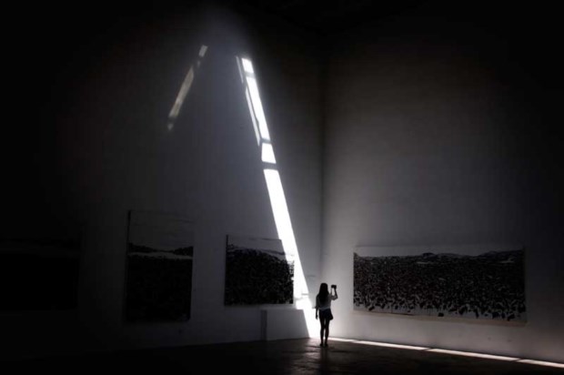 ÁUSTRIA, 9.10.2012. A admirar e fotografar uma obra em frente do Museu Leopold em Viena - faz referência à expo "Homem Nu" e dedica-se a mostrar a nudez masculina dos anos 1800 até hoje Heinz-Peter Bader/Reuters