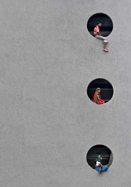 BANGLADESH, 19/09/2012. Na parte antiga de Daca, a capital, uma rapariga observa treinos do exército e bombeiros. As aparências enganam: as rachas na parede são falsas e fazem parte do exercício Andrew Biraj /Reuters