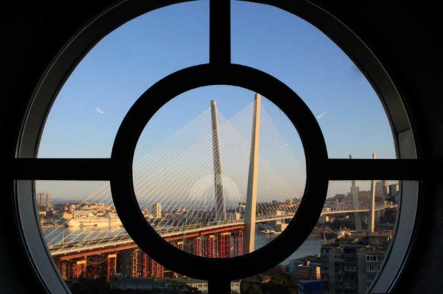 RÚSSIA, 10.09.2012. A nova ponte de Vladivostok, sobre a baía, vista de uma janela vizinha. Sergei Karpukhin/Reuters