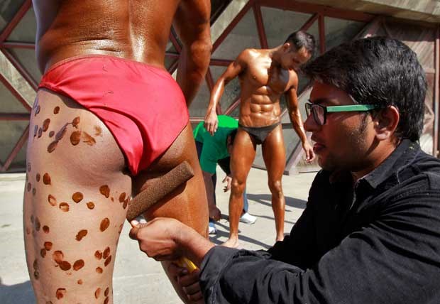 Caxemira (Índia), 20/09/2012. A aplicar "bronzeador" artificial num participantes antes de uma competição em Srinagar Fayaz Kabli/Reuters